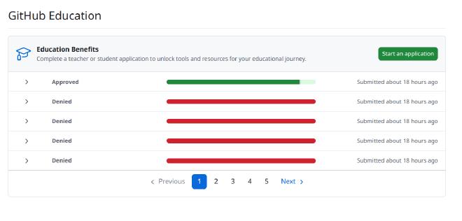 上传之后点击 Submit application即可,等待2-3分钟。如果成功会显示Approved,否则是Denied,同时失败的话 GitHub 会发邮件到你的教育邮箱,告知你失败的原因。根据失败原因调整,重新提交申请,多试几次。(笔者试了20次😅,不过读者按上述操作的话应该能很快成功)