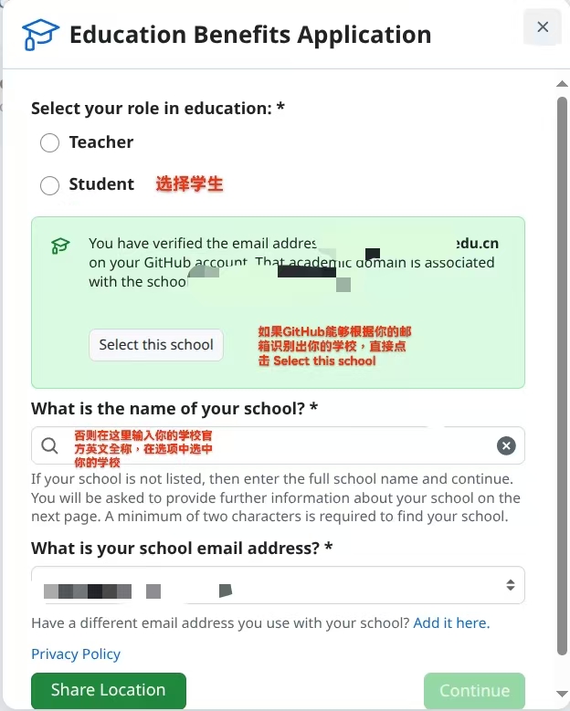 注意:点击 Share location 前请关闭科学上网**,分享完之后再开,然后点击 Continue