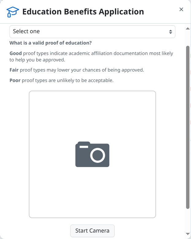 点击 Start Camera, 拍摄你的证明文件,注意尽可能地让名字和日期显眼一些,也要把学校的 Logo 拍进去