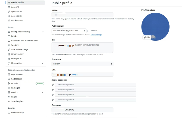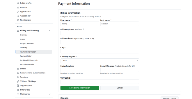 账号信息设置(最关键的一步!) 笔者因为账号设置的问题申请失败了二十次(特别鸣谢 GitHub 的优秀审核系统),折腾了好几个小时,包括但不限于拿着录取通知书对着电脑屏幕手舞足蹈,将自己的中文/英文姓名各种排列组合填进账号信息……终于在即将崩溃的时候灵机一动成功了。