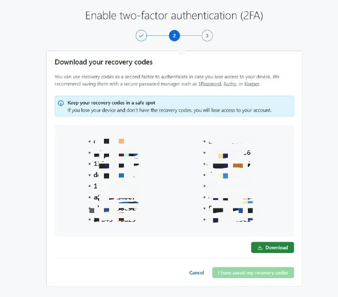 点击右下角 Download 把恢复码下载并保存好。(这个是当认证软件失效时的备用验证方式,一旦丢失将会无法验证,务必好好保存!)再点击 I have saved my recovery codes即可