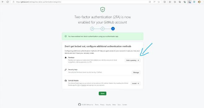 - 进入流程3,如果电脑有 Windows Hello 人脸识别或者指纹识别模块可以点击图中的 Add a passkey 方便以后登录